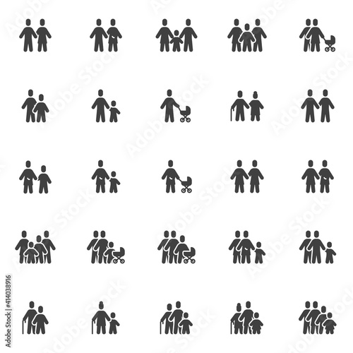 Family and relationship vector icons set, modern solid symbol collection, filled style pictogram pack. Signs, logo illustration. Set includes icons as four people family, mother, father, son, daughter