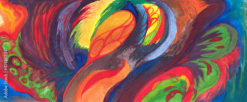 The abstraction is painted by hand with watercolors. Bright red and green, blue and yellow with textured surfaces and brush strokes, an egg in the center of an avant-garde composition