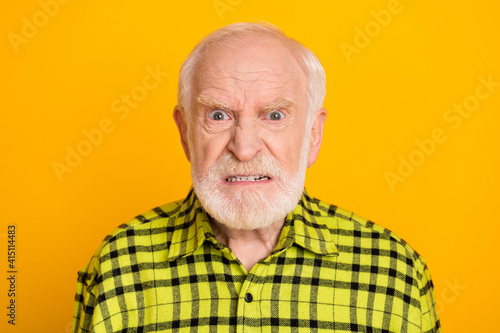 Photo of angry old man pensioner unhappy mad crazy conflict disagreement isolated over yellow color background
