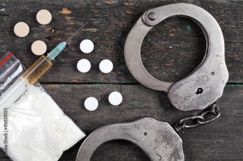 Syringe with cocaine and police handcuffs on a dark wooden background, top view