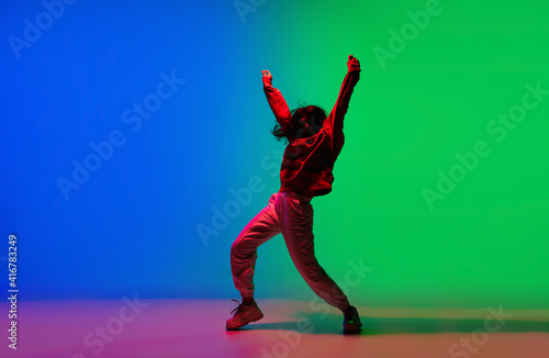 Modern. Stylish sportive girl dancing hip-hop in stylish clothes on colorful background at dance hall in neon light. Youth culture, movement, style and fashion, action. Fashionable bright portrait.