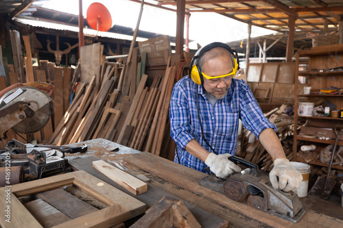 senior asian man carpenter wearing glasses and headphone, using electric wood planers on a piece of wood in workshop