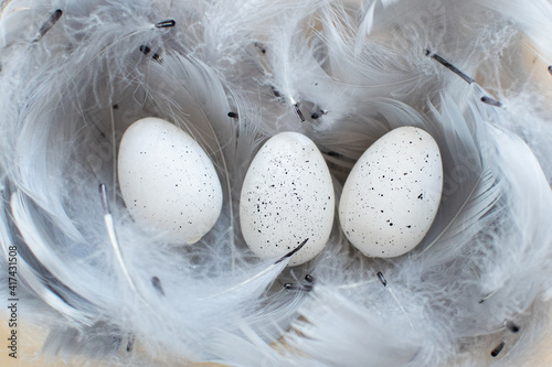 Białe nakrapiane wielkanocne jaja otoczone piórami, wielkanoc