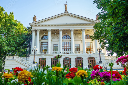 Drama Theater named after Lunacharsky, Sevastopol, Crimea. Building built in the classical style. Shot as it looks from a flower bed (slightly blurred in the foreground).