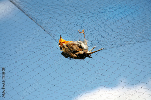 Petirrojo, Erithacus rubecula, atrapado en una red para pajaros y visto desde abajo, con cielo azul de fondo.