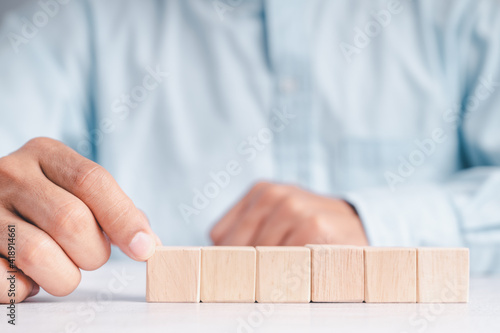 Businessman wearing a blue shirt, arranging the empty wooden blocks with his hands. Which is placed on a white wooden table. Business strategy and action plan. Copy space.