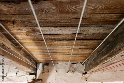 Stary strych. Dach z drewnianych belek i desek. Sznurki na bieliznę i lampa.