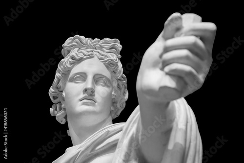 God Apollo bust sculpture. Ancient Greek god of Sun and Poetry Plaster copy of a marble statue isolated on black