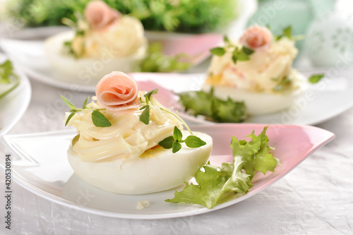 eggs with mayonnaise stuffed with vegetable salad on Easter table