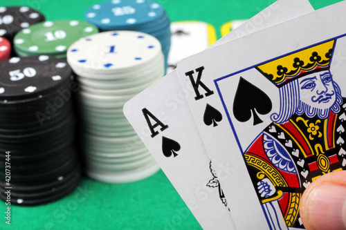 poker chips and cards on the table, a winning combination of ace karol cards. Close-up.
