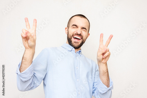 Bearded having fun, man shows peace signs with fingers, white background, copy space