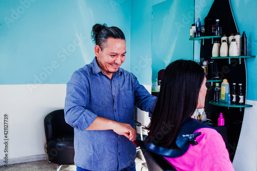 latin man working as a hairdresser and cutting hair of a female customer in a beauty salon small business in Mexico city