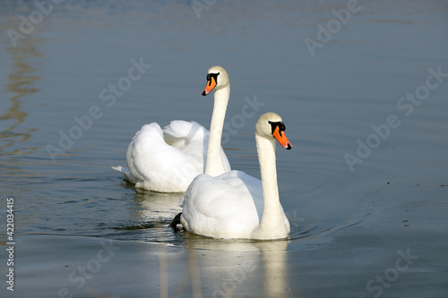 WROCLAW, POLAND - FEBRUARY 22, 2021: Two Mute Swans on a frozen lake. The Milicz Ponds (Polish: Stawy Milickie). Nature Reserve in Barycz Valley Landscape Park, Poland, Europe.