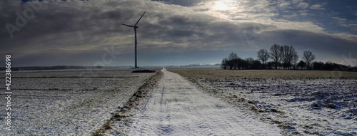 WIATRAK. POCZATEK DNIA W ZIMOWY PORANEK. WIDOK NA WIATRAK NA POLU W POCHMURNY PORANEK.