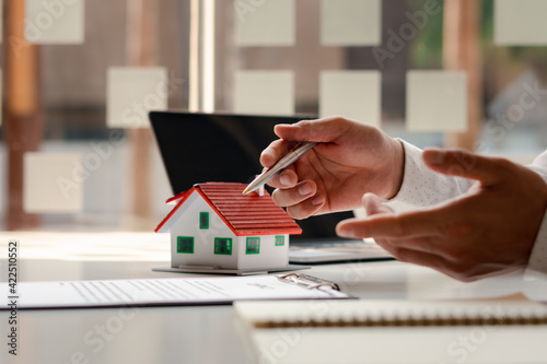 Buying a Home or Insurance, an insurance agent explains the lease agreement to a client before making a contract. Mortgage loan approval home loan and insurance concept.
