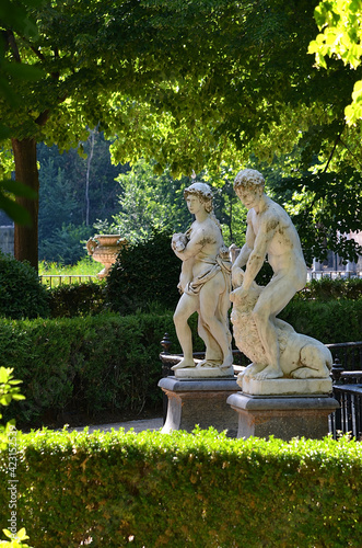 Statue nei giardini del Palazzo Reale di Aranjuez. I giardini di Aranjuez sono un insieme di foreste e parchi paesaggistici e decorati situati nella città spagnola di Aranjuez, vicino a Madrid.