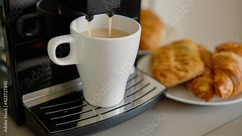Poranna kawa płynąca z ekspresu ciśnieniowego. W tle maślane rogaliki