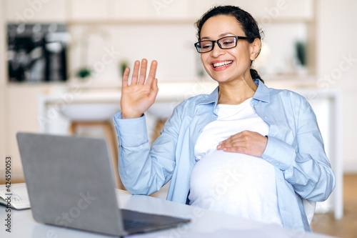 Online meeting concept. Successful pregnant mixed race woman, coworker, business lady uses laptop, communicates via video conference, conducts virtual meeting with client or employee, gesture hands