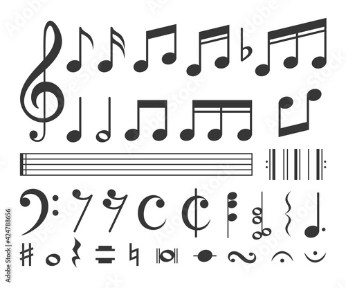 Music note. Vector icon set of music notes for musical apps, websites isolated on white background. Black silhouette musical key signs for song, melody, tune, instrumental scores.Musical notation note