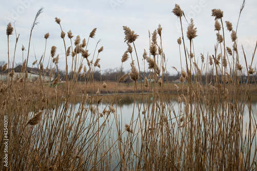 dry reeds by the lake in the village. lots of beige reeds