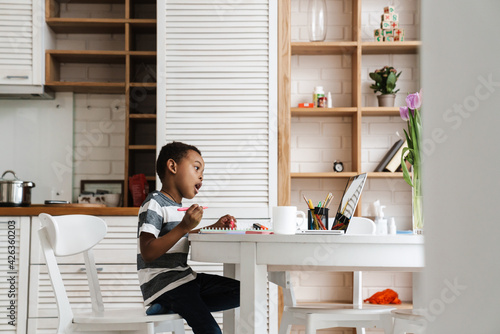 Black boy using laptop and drawing while sitting at home