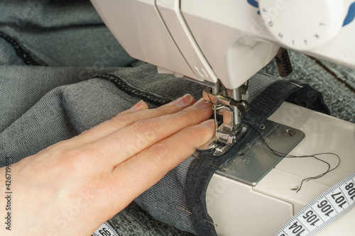process of shortening jeans pants on a sewing machine