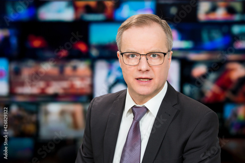 An anchorman reporting live breaking news sitting in Tv studio. Background of multiple screens of broadcast control room. Journalism concept