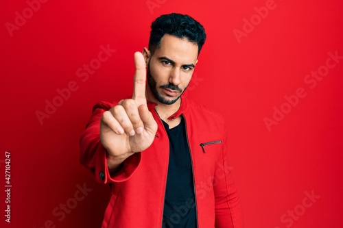 Young hispanic man wearing red leather jacket pointing with finger up and angry expression, showing no gesture
