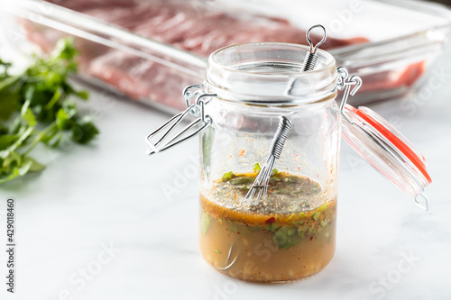 Close up of a small jar filled with a cilantro lime marinade mixture with raw flank beef in behind.