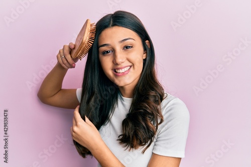 Young hispanic woman styling hair using comb smiling with a happy and cool smile on face. showing teeth.