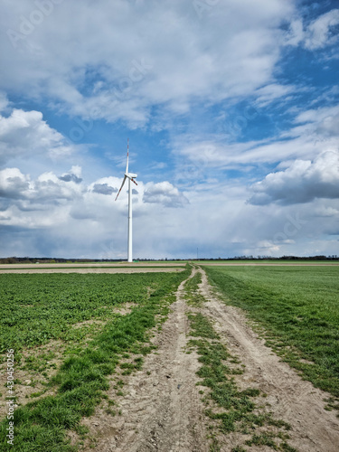 WIATRAK. WIDOK NA WIATRAK NA POLU W POCHMURNY DZIEŃ.