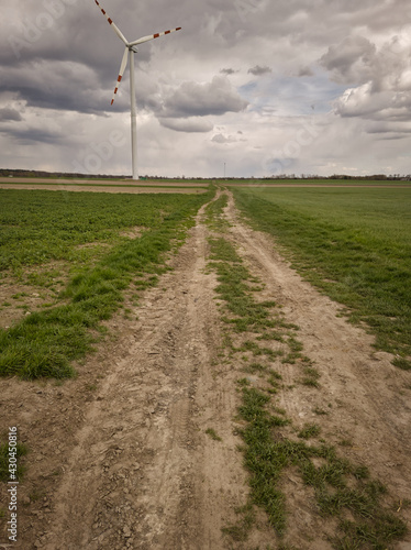 WIATRAK. WIDOK NA WIATRAK NA POLU W POCHMURNY DZIEŃ.