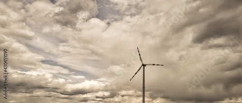 WIATRAK. WIDOK NA WIATRAK NA POLU W POCHMURNY DZIEŃ.