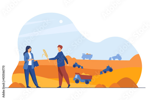 Farmer giving ear of grain to businesswoman. Construction machinery altering landscape flat vector illustration. Agriculture, construction work concept for banner, website design or landing web page