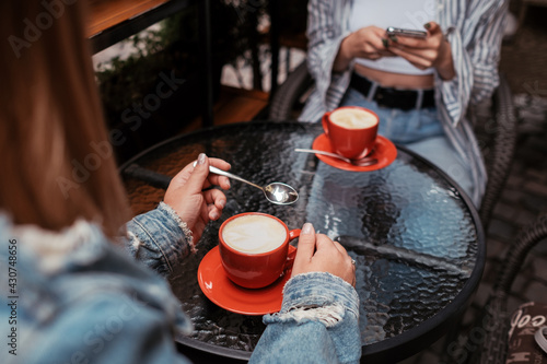 Two Women Friends Drinking Coffee in Cafe Outdoors, Lunch Time Concept