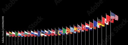 The 30 waving Flags of NATO Countries - North Atlantic Treaty. Isolated on black background - 3D illustration.;