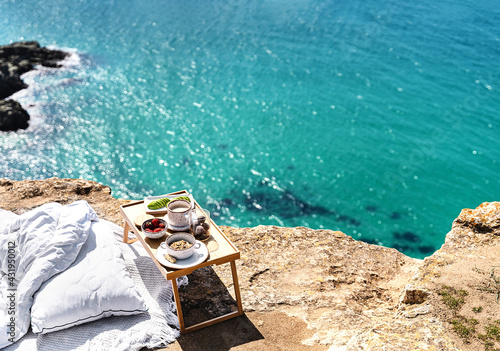Beautiful festive breakfast with seascape view on the brink of a precipice. Travel and healthy lifestyle concept.