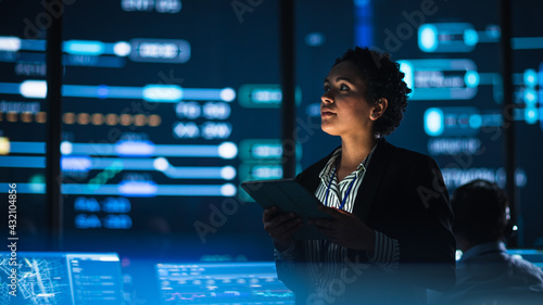 Young Multiethnic Female Government Employee Uses Tablet Computer in System Control Monitoring Center. In the Background Her Coworkers at Their Workspaces with Many Displays Showing Technical Data.