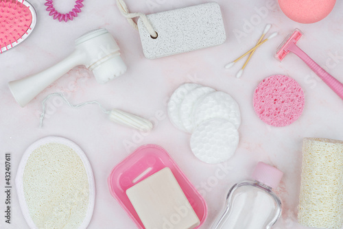 Skincare flatlay concept, cosmetic accessories and products for cleansing, massage, treatment, moisturizing, elasticity of the face and body, hygiene, youth and health of the skin