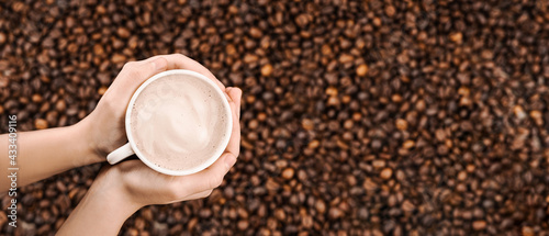 A cup of coffee in hands. Background of kogo bean