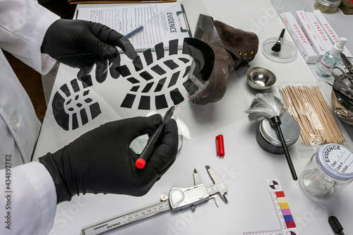 Police scientist investigates with a scale on a shoe sole tape tread involved in crime lab murder, concept image