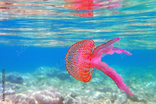 #1041492428Vibrant Underwater Scene Featu Multiple Jellyfish Swimming with Transparent Bell Shapes and Long Tentacles in Clear Ocean Water