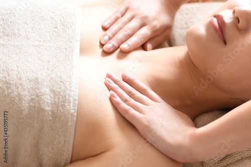 エステサロンでデコルテのマッサージの施術を受ける若い女性