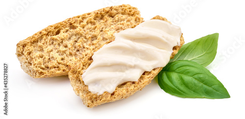 Crostini with cream cheese, isolated on white background. High resolution image.
