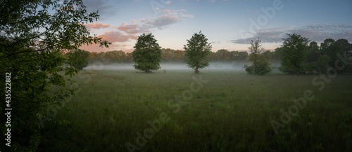 Wald und Wiese im Morgendunst vor Sonnenaufgang bei Lingen in Niedersachsen
