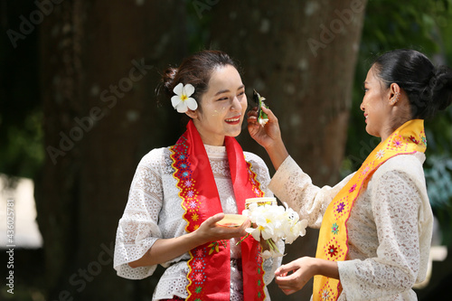 Two Myanmar women holding flowers at a temple. Southeast Asian young girls with burmese traditional dress visiting a Buddihist