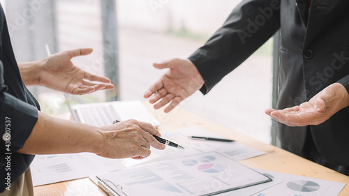 Senior businessman analyzing marketing data staff people discuss work plan pointing at papers at group meeting