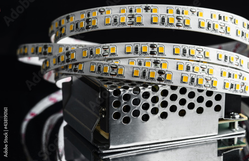 LED strip for 12 volt voltage with power supply on a black mirrored background.