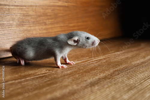 Small grey rat near wooden wall on floor
