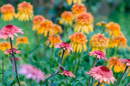 pink and orange echinacea flower, extraordinary color, dark green leaves